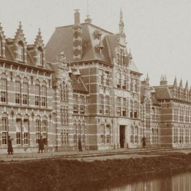 Langgerekt symmetrisch gebouw bestaande uit een middenpartij van drie bouwlagen die door terugliggende bouwdelen van twee lagen verbonden wordt met twee sterk risalerende hoekpartijen waarvan de eerste verdieping ten opzichte van de terugliggende bouwvolumes enigszins hoger is opgetrokken. De terugliggende bouwdelen hebben middenvoor een risaliet met topgevel waarachter een leigedekt zadeldak en, evenals de hoekpartijen, een afgeplat schilddak met gesmoorde kruispannen. Op het hoge afgeplatte schilddak boven de middenpartij liggen leien in maasdekking. De middenpartij wordt middenvoor ook geleed door een risaliet met topgevel waarachter een leigedekt zadeldak. De buitenmuren zijn boven een hardstenen plint met geprofileerde bovenrand opgetrokken in rode machinale baksteen (formaat 21 x 5 cm) in kruisverband met snijvoeg. Het metselwerk wordt verlevendigd door banden van kalksteen ter hoogte van de onder-, tussen- en bovendorpels van de vensters, en dito sierblokken ter weerszijden van de vensters. Al het toegepaste kalksteen is crèmekleurig. De lekdorpels onder de benedenvensters zijn evenals de cordonlijst onder de verdiepingsvensters uitgevoerd in hardsteen. Onder de cordonlijst loopt een ter plaatse van de middenrisaliet onderbroken fries van oranje verblendsteen en beigekleurige kunststeen, waarin blokken kalksteen bewerkt in de vorm van een kussen, rolwerk of triglief. Ter hoogte van de verdiepingsvloeren zijn de midden- en hoekpartijen voorzien van rijk gekrulde smeedijzeren muurankers. Opvallend zijn de krijgshaftige bliksemmotieven in de ankers boven de begane grond van de hoekpartijen. De hoofdingang in de risaliet van de hoge middenpartij wordt geflankeerd door kalkstenen pilasters met bovenin in reliëf een Medusakop waaronder een helm en wapens. Boven de ingang bevindt zich een grote liggende gevelsteen van kalksteen met tussen rol- en bladwerk een tekstveld waarop vroeger de naam "CADETTENSCHOOL" stond. Hierboven zijn op de eerste verdieping twee kruisvensters (vroeger twaalfruits schuifvensters) aangebracht waarboven een vergelijkbare gevelsteen met het rijkswapen temidden van vaandels en wapentuig. Het rijkswapen wordt geflankeerd door kalkstenen medaillons met rechts en profil koningin-regentes Emma, en links de nog jonge koningin Wilhelmina. De korfbogen boven de twee kruisvensters op de tweede verdieping van de middenrisaliet zijn voorzien van kalksteenblokjes. De topgevel erboven telt vier vensters: twee hoge vensters tussen twee lagere. Onder de vier vensters loopt een cordonlijst waaronder een rollaag van afwisselend rode en oranje strekken boven een uitkragende sierrand van kalksteen. Boven de twee middelste vensters bevindt zich een door kalkstenen pilasters en klauwstukken geflankeerde gevelsteen met tussen gebeeldhouwde vleugels (symbool voor de tijd) een rondnis waarin een wijzerplaat. De topgevel eindigt in een door een halfrond fronton bekroonde tuit, met in het midden een overhoekse pilaster en ter weerszijden van de voet een voluut. Onderaan de met kalksteen afgedekte topgevel staat links en rechts een leeuw met (vlak) wapenschild. Hieronder is de middenrisaliet tot beneden aan toe voorzien van kalkstenen hoekblokken. Links en rechts van de risaliet telt de middenpartij op alle bouwlagen twee kruisvensters. In het midden van de hanenkammen boven de vier benedenvensters bevindt zich een gebeeldhouwde sluitsteen in de vorm van een mannenhoofd met helm. De twee kalksteenblokken in de hanenkam ter weerszijden van de sluitsteen zijn voorzien van een diamantkop. De vensters op de eerste verdieping hebben rondbogen van rode profielsteen waarin kalkstenen blokjes. De vier boogtrommels zijn uitgevoerd als kalkstenen reliëf en tonen attributen die betrekking hebben op de krijgskunde. De lateien boven de lagere kruisvensters van de minder hoge tweede verdieping maken deel uit van een kalkstenen architraaf. Het fries erboven is samengesteld uit gebeeldhouwde consoles in de vorm van een mannenhoofd, waartussen siermetselwerk van rode en oranje baksteen. De hoofden dragen een houten gootlijst. Ter weerszijden van de topgevel is op twee niveaus in het voorschild van de middenpartij een kleine dakkapel aangebracht met een overstekend dak (de twee bovenste leigedekt, de twee onderste met zink) bekroond door een spitse zinken piron met halverwege een bol. De terugliggende geveldelen ter weerszijden van de middenpartij worden afgesloten door een houten gootlijst op kalkstenen voluutconsoles waartussen oranje verblendsteen. De risaliet in het midden van beide geveldelen heeft speklagen en een spaarveld waarin drie smalle terugliggende venster-assen met op beide bouwlagen drie smalle vensters. De rijk uitgevoerde trapgevel bovenin is ondermeer voorzien van een kruisvenster met geprofileerde omlijsting, voluutvormige klauwstukken en consoles, gecanneleerde pilasters, en bovenop een halfrond fronton bekroond door een piron. Ter weerszijden van de twee risalieten zijn op de begane grond drie gekoppelde vensters aangebracht, en op de eerste verdieping twee kruisvensters waarboven geprofileerde kalkstenen lateien. De rondbogen boven de benedenvensters zijn voorzien van kalkstenen blokjes, waaronder een sluitsteen met kussenreliëf. De vulling van de boogtrommels bestaat uit siermetselwerk van rode baksteen en oranje verblendsteen.