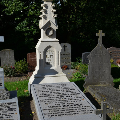 FAMILIEGRAF "De Wit", deel uitmakend van het rooms-katholiek kerkelijk complex St. Laurentius. Het in neogotische stijl uitgevoerde grafmonument van de familie De Wit dateert gezien de oudst vermelde overlijdensdatum (11-11-1884) vermoedelijk uit 1885. Dit familiegraf is gezien de stilistische overeenkomsten met het priestergraf wellicht eveneens ontworpen door architect E.J. Margry.
