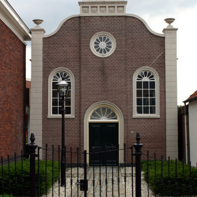 De in Eclectische stijl vormgegeven KERK met bijbehorend HEKWERK is in 1866 gebouwd voor de Vereniging van Vrijzinnig Hervormden ter vervanging van een 17de-eeuwse kerk, die weer een opvolger was van een (in 1652 verbrande) houten kerk gebouwd na de Dordtse Synode t.b.v. de Remonstranten.