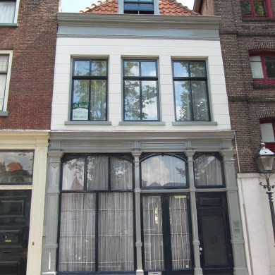 Hoekpand Nieuwsteeg met lijstgevel. In baksteen 1844. Deur met gesneden kalf en pilasteromlijsting.