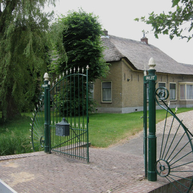 Het toegangshek is gaaf in hoofdvorm en in onderdelen.