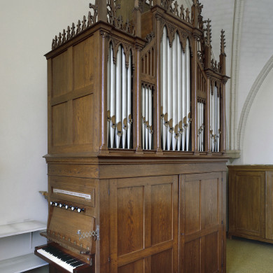 Aan de zijkant boven het toetsenbord een geschilderde banderol met de tekst: "Laudate cum in tympano et choro: laudate cum in choris et organo".