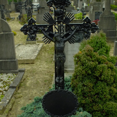 Het ajour gietijzeren grafkruis is identiek aan grafkruis 525219: het heeft in het centrum een opgebrachte, eveneens gietijzeren afbeelding van de gekruisigde Christus, omgeven door een stralenkrans. Op de kruisbalken verder florale motieven, de tekst: "I N R I" en enkele engelenkopjes.