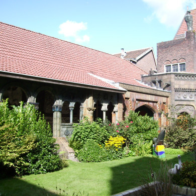 De rechthoekige binnentuin is voorzien van een rechthoekige vijver met afgeschuinde hoeken. Op de korte zijde van de vijver ligt een smalle tuinstrook, die wordt gemarkeerd door gebogen keramische tegels. Deze tegels zijn eveneens rondom de vijver aangebracht. De vijver en de strook zijn gelegen in een grasveld. Naast de vijver bevindt zich een keramische fontein met figuratieve motieven. De aan de westzijde van de tuin gelegen bogengalerij is opgebouwd uit een reeks van bouwkeramische bogen in verschillende historiserende stijlen, waaronder de Neo-Romaanse stijl, de Neo-Gotiek en het Oriëntalisme.