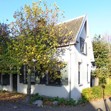 Huisje met zadeldak tegen het kerkhof gelegen.