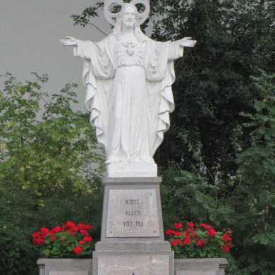 Het beeld staat op een uit drie traptreden bestaande polygonale onderbouw, waarop een hardstenen vierkante sokkel is geplaatst, geflankeerd door kleinere bloembakken van dito materiaal. Op de bakken de letters alfa (links) en omega (rechts), terwijl centraal het IHS-monogram staat afgebeeld. Op de uit hardstenen platen bestaande, verjongende opbouw is aan de voorzijde een hardstenen plaquette aangebracht met de tekst: "Komt / allen / tot mij". Het beeld is geschilderd, waarschijnlijk vervaardigd uit kunststeen en voorzien van een gietijzeren stralenkrans.