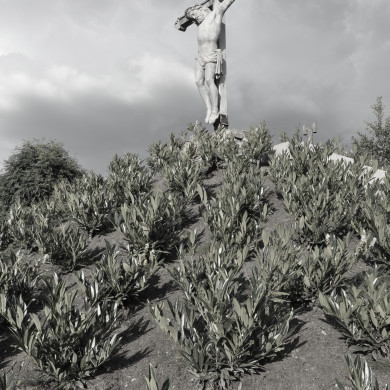De neogotische CALVARIEBERG met KRUIS en CORPUS werd aan het einde van de negentiende eeuw geplaatst. Het object bevindt zich in de as van het middenpad als afsluiting van het kerkhof. Dit aan het eind van de negentiende eeuw gerealiseerde beeld is uitgevoerd in het hiervoor zelden toegepaste zink.