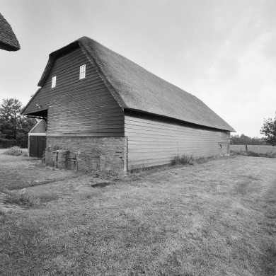 De hoge éénlaagse schuur heeft een rechthoekige plattegrond en een wolfsdak met riet. De borstweringen zijn nu opgemetseld van handvorm en machinale baksteen, verder zijn drie gevels ingevuld met gepotdekseld hout. In de voorgevel bevinden zich twee vierruits raampjes in de nok, in de achter- en linkerzijgevel houten staldeuren en een halfrond raam in de rechterzijgevel.