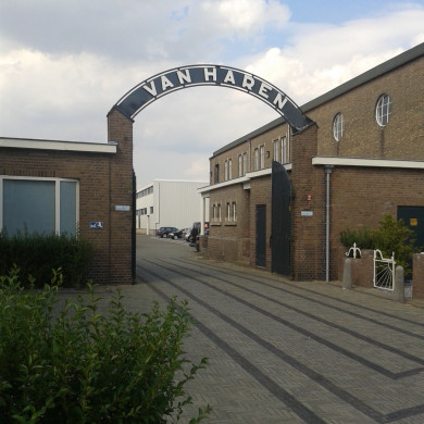 Tegen de aangrenzende gebouwen zijn gemetselde pijlers geplaatst. Daarop rust een metalen boog met het opschrift "VAN HAREN". Tussen de pijlers bevindt zich een openslaand ijzeren spijlenhek.