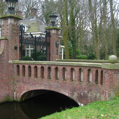 De brug met toegangshek is gaaf wat betreft hoofdvorm, materiaalgebruik en detaillering.