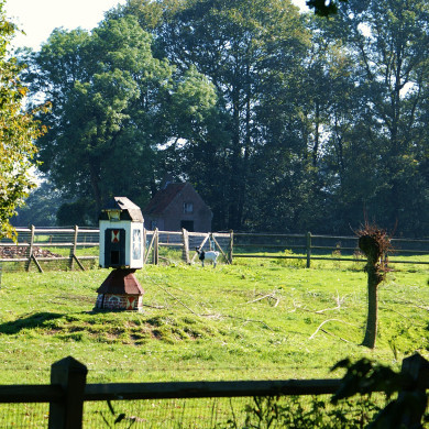 De toegang, oorspronkelijk bestaande uit een opgeklampte deur (verwijderd), bevindt zich aan de korte westzijde. Hierboven een klein luik. In de lange noordelijke en zuidelijke gevels een zesruits raam met ijzeren kozijn en afzaat.