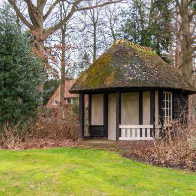 Het eenlaagse theehuis heeft een achthoekige plattegrond. Het is gedekt door een rieten schilddak. Aan de straatkant heeft het een vijfzijdige veranda met een houten balustrade. Het dakoverstek boven de veranda wordt gedragen door vier vierkante houten kolommen. De toegang bestaat uit twee houten schuifdeuren met glasroeden. Aan beide zijkanten een roedenvenster. Het opgaande werk bestaat uit een bakstenen basement met daarop een houtskelet, dat aan de buitenkant is voorzien van potdekselwerk. De veranda heeft een vloer van rode plavuizen.