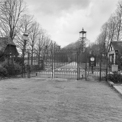 Het decoratief opengewerkte en symmetrische smeedijzeren hekwerk, bestaat uit een dubbel, openslaand toegangshek met rechthoekige, door een lantaarn bekroonde hekstijlen en links en rechts ervan een kleiner, enkel toegangshek. Deze zijn bevestigd aan kleinere, eveneens rechthoekige hekstijlen, die krulmotieven als bekroning hebben, maar tevens zijn voorzien van een paneel. Ook de stijlen waarop de vierkante lantaarns zijn geplaatst zijn voorzien van voluutvormig krulwerk. De lantaarns worden afgedekt door ingesnoerde koperen tentdakjes met naaldvormige bekroning. Aan weerszijden van de toegangshekken bevindt zich een ermee verbonden erfscheiding in de vorm van minder hoog opgaande smeedijzeren hekken, geplaatst op uit grauwe baksteen opgetrokken muurtjes met hardstenen dekplaten. De muurtjes buigen aan het uiteinde weg in de richting van het landgoed. De samenstellende hekdelen hebben een doorlopend motief van stijlen en decoratief krulwerk.