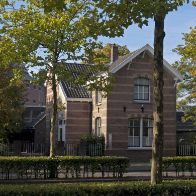 De voormalige DIENSTWONING voor een gevangenisbewaarder is samen met de vijf naastgelegen identieke dienstwoningen ontworpen in 1883 door J. F. Metzelaar bij de strafgevangenis.