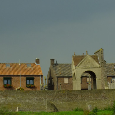 Kerkhof met benedenste muurwerk van de oude St. Vituskerk, XV en XIXb, die in 1944 verwoest werd.