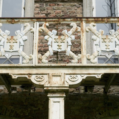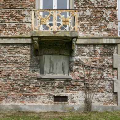 Noordelijk van het kasteel een midden 19de-eeuwse gietijzeren voetgangersbrug met gebogen hekken op bakstenen landhoofden; brughekken in sobere neo-Lodewijk XIVde stijl met voluutvormige steunen op het houten brugdek.