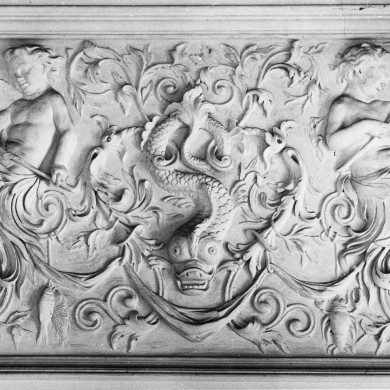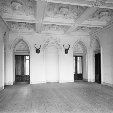 Grote kamer aan de noordzijde: ondiep neorenaissance cassettenplafond; stookplaats met gekoppelde marmeren pilasters; langs de diepe raamnissen houten colonetten met verguld en rood geschilderde kroontjes; ingelijste stucwerk taferelen van vrouwenkopjes temidden van ranken en bladwerk aan beide zijden van de schoorsteen; op de westwand met putti die symbolen van de jacht, respectievelijk van de visserij dragen; op de houten vensterluiken kolonetten en vierpassen.