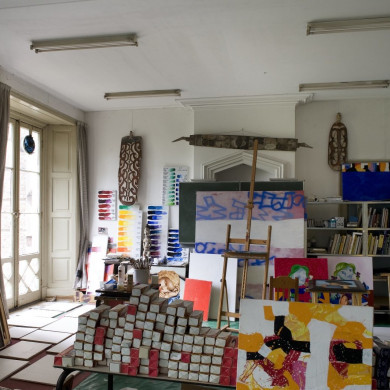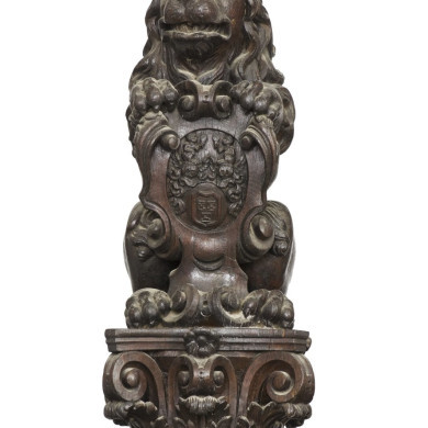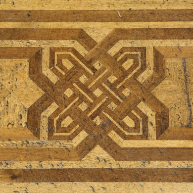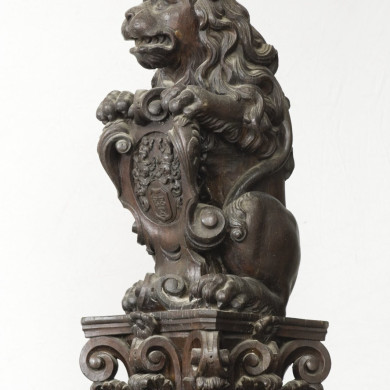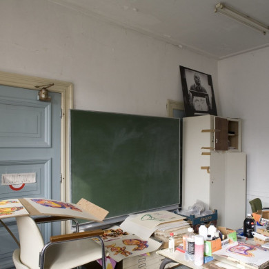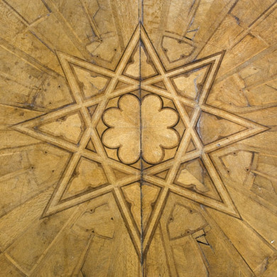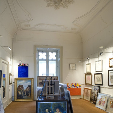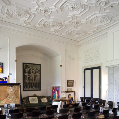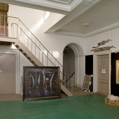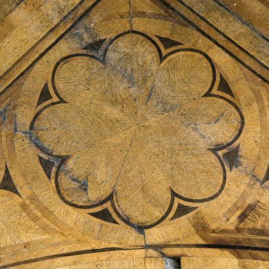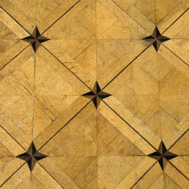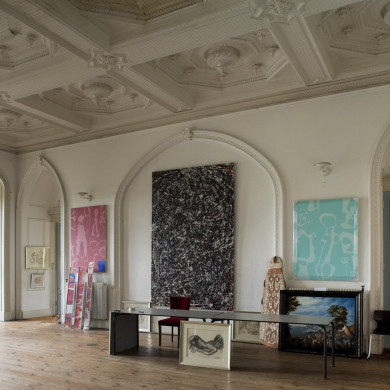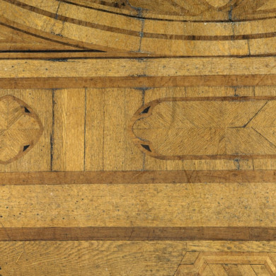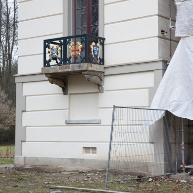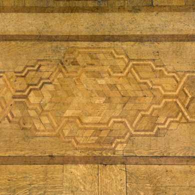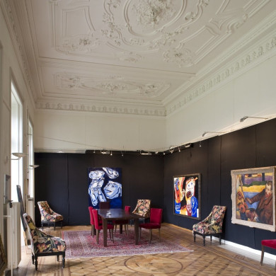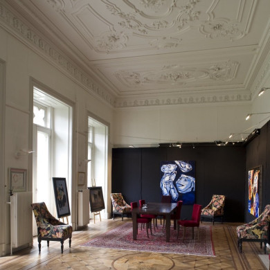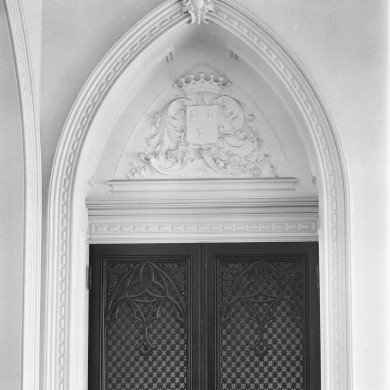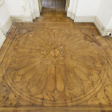 Grote salon aan de noordwestzijde: stucplafond in drie vakken gedeeld; parketvloer draagt in het midden ovaal medaillon dat een gekroond wapen bevat met als wapendragers een adelaar en een leeuw; het wapen is gevuld met leeuwen in verschillende kleuren en afmetingen.