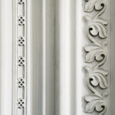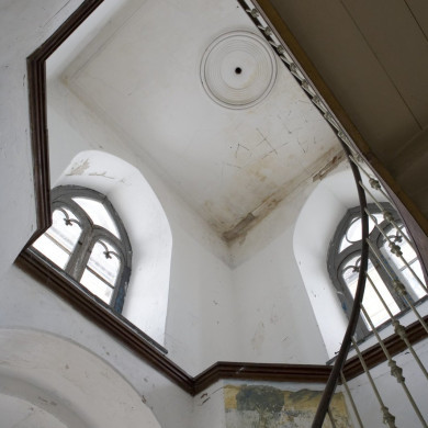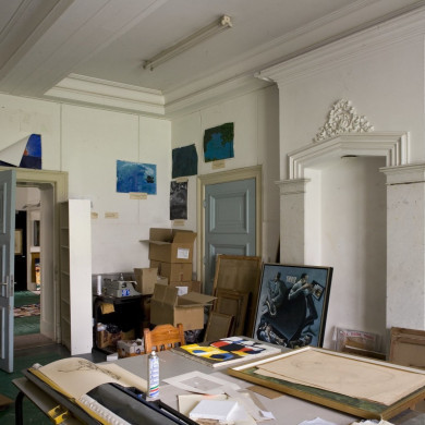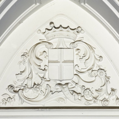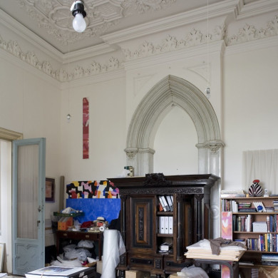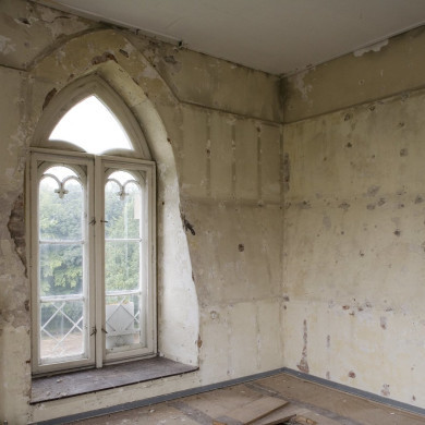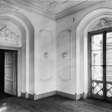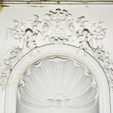 Kamer aan de oostzijde: marmeren spitsboognis om de stookplaats, vensters voorzien van luiken, stucplafond van hoge kwaliteit.