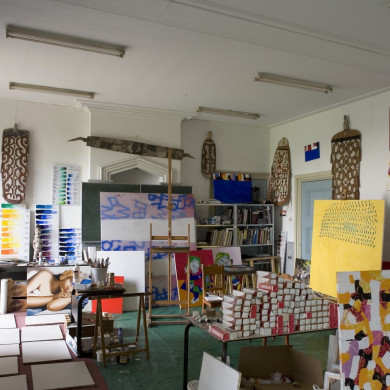 Hoekkamer in zuidtoren: stucwerk plafond tweede helft 19de eeuw, daarin kruisribgewelf met in de velden rozetten; deuromlijsting geprofileerd en voorzien van bladwerk; dessus de porte met de letters I en J; bijzonder aangelegde parketvloer met grote rozet in het midden.