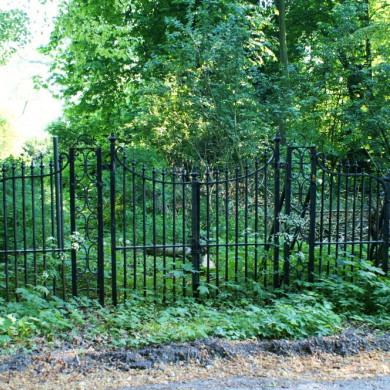 Het pad over de voetgangersbrug voert naar een laat 19de-eeuws smeedijzeren hek in neo-Lodewijk XIVde stijl op de grens van het park en het bosgebied; het hek heeft dubbele panelen en zijstukken; links en rechts is het grote hek verbonden met een uit het begin van de 20ste eeuw daterend eenvoudig ijzeren hek, dat het park omgeeft.
