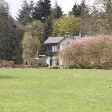 HISTORISCHE TUIN- EN PARKAANLEG. De 19de-eeuwse aanleg in 'Zwitserse' landschapsstijl is vermoedelijk van de hand van tuinarchitect J.D. Zocher jr. Gebruikmakend van het natuurlijke reliëf van het terrein is voor het huis een omlaag lopende glooiende weide gecreëerd (uit het bos gespaard) omsloten door coulissewanden van het omringende bos met vergezichten onder andere naar de Amerongse berg en als 'point de vue' de boerderij De Laagt. De weide is als 'alm' aangelegd en ingericht met clumbs van (rode) beuk. Doordat de boomgroepen en het omringende bos thans enigszins zijn uitgegroeid, zijn de zichtlijnen op De Laagt en in zuidoostwaartse richting niet meer duidelijk aanwezig. Oorspronkelijk liepen twee gebogen paden door de weide naar beneden, waarvan er één resteert. Op oude Topografische Militaire Kaarten is rondom de weide een lobvormig padenpatroon door het bos te zien, dat thans niet meer aanwezig is.