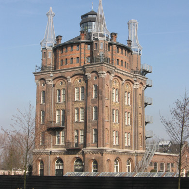 WATERTOREN voor de drinkwatervoorziening met machinistenwoningen en kantoortje en een aangebouwde machinekamer en ketelhuis. De watertoren is gebouwd in 1882 naar een ontwerp van de directeur van Gemeentewerken van Dordrecht, J.A. van der Kloes. De 33 meter hoge, niet meer als zodanig in gebruik zijnde watertoren is gebouwd in de voor de bouwtijd karakteristieke stijl van het Eclecticisme met invloeden van de in opkomst zijnde Neo-Hollandse Renaissance. Het robuuste "chateau d'eau" werd ingericht met een reinwaterkelder en het oudste nog bestaande ijzeren vlakbodemreservoir in Nederland met een inhoud van 500 m3. Om de waterdruk te verhogen werd in 1938 de toren voorzien van een 16 m hoge standpijp met een diameter van drie meter, die inmiddels grotendeels weer is verwijderd. De bovenbouwen van de vier hoektorens zijn in 1938 afgebroken. In de machinekamer en het ketelhuis aan de achterzijde van de toren zijn in de loop der tijd nieuwe vensters geplaatst.