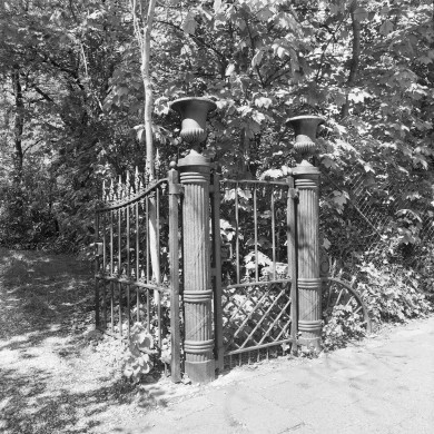 Aan de Herenweg staat een gietijzeren toegangshek uit ca.1865 bestaande uit (van links naar rechts) een halfrond zijstuk aan de slootzijde, een gecanneleerde zuil bekroond door een vaas, een vast spijlenhekwerk waarvan het onderste deel in kruisverband en decoraties aan de bovenzijde, een gelijkvormige zuil, dubbele hekvleugels met rijk gedecoreerde spijlpunten, en vervolgens weer een zuil, hekwerk, zuil en zijstuk. Aan de linkerkant op een kademuur staat een restant van een spijlenhek.