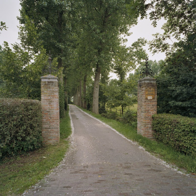 Ad. a. De oprijlaan is geasfalteerd en loopt van de Hoofdstraat tot aan de noordpoort (ingang tot de voorhof); ter weerszijden een enkele bomenrij, bestaande uit populieren (naar schatting geplant omstreeks 1950); het inrijhek met bakstenen pijlers is nieuw en valt buiten de bescherming.