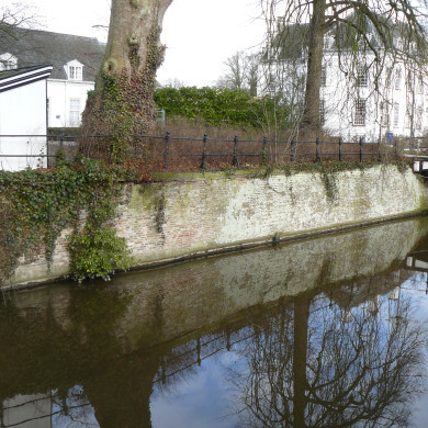 Langs de voorzijde van het westelijke eiland een achttiende-eeuwse bakstenen kademuur onder een stenen afdekplaat.