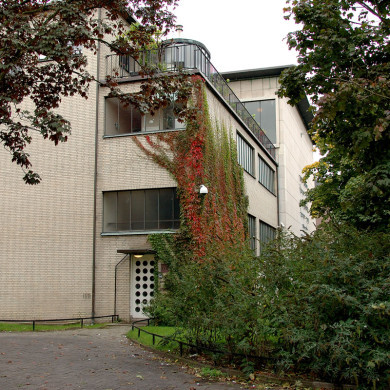 (Woning behorend tot het) COMPLEX VAN ATELIER- EN GEZINSWONINGEN in verschillende typen, ondergebracht in een langgerekt, platafgedekt en vrijstaand bouwblok dat zes, respectievelijk vijf, bouwlagen telt voor de woningen en vier hoge lagen voor de ateliers; opgetrokken als staalskelet, waarbij de