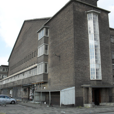 Interieur Het interieur wordt zonder tussenkomst van steunpunten door zestien stalen spanten in vollewandconstructie overspannen. De rechte en gesloten spantbenen, gestabiliseerd door open en gesloten korbelen, ontmoeten elkaar onder een stompe hoek ter hoogte van de nok. De spantbenen zijn door stalen I-profielbalken als gordingen onderling met elkaar verbonden. Ter plaatse van de zijmuren is alleen de aanzet van de spantbenen te zien. Acht tegen de korte wanden geplaatste, van windverband voorziene verticale stijlen ondersteunen het schuine dakvlak. Aan beide lange zijden bevinden zich acht luchtverhitters met een krulornament. De korte wanden bevatten drie galerijen met lange gemetselde borstweringen, tussen de verticale vakwerkconstructies. De bovenste twee galerijen worden verlicht via de in serie geschakelde vensters. De korte gevels hebben in de top een klok. De achtergevel is voorzien van een bordestrap met stalen buisleuningen en roodbruine tegels als afdekking van de zijmuurtjes; de gele vloerklinkers zijn in metselmozaïek gelegd. De binnenmuren zijn opgetrokken in gele geglazuurde, machinaal gevormde bakstenen. De lange wanden bevatten boven de toegangen en voormalige koelcellen op de eerste en tweede verdieping, overkragende kantoren. De kantoren hebben op beide bouwlagen zestien groepen van drie achtruits ramen. Daarboven bevindt zich een galerij met boven iedere groep ramen één deur. Hierboven, tussen de aanzetten van de spantbenen, komen in bijna elke travee vijf luchtopeningen voor.