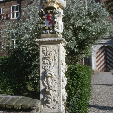 Twee voor de dam naar de poortdoorgang van de hoofdburcht gesitueerde sokkels met wapenleeuwen. De in rijke Westfaalse ornamentele stijl opgetrokken rechthoekige sokkels zijn vermoedelijk omstreeks 1701 vervaardigd en op deze plaats opgesteld, gezien de stilistische overeenkomst met het in deze stijl en in dit jaar uitgevoerde bordes met ingangspartij van de hoofdwoonvleugel op de hoofdburcht.