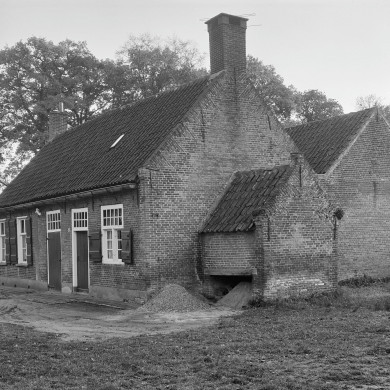 DIENSTWONING ANNEX BAKHUIS. Rode bakstenen dienstwoning (oorspronkelijk herbergde het pand twee woningen) op rechthoekige grondslag onder met rode pannen gedekt zadeldak, gesitueerd ten zuidwesten van het park in landschapsstijl aan de achterzijde van Huis de Moeren. De woning dateert uit de eerste helft van de 18de-eeuw uit de tijd dat op De Moeren nog geen hoofdgebouw stond en is vanouds de dienstwoning van het landgoed. In 1900 werd aan de ZO-zijde een stuk aangebouwd; een pilaster aan de voor(NO-gevel) geeft de scheiding aan tussen het oude en nieuwe gedeelte. Aan de rechter achterzijde een rode bakstenen aanbouw onder met grijze pannen gedekt zadeldak met vier hoge schuiframen met 12-ruitsbovenvenster en 4-ruits ondervenster, eveneens uit de eerste helft van de 18de eeuw; wellicht heeft deze aanbouw als heerschapskamer dienst gedaan. Voorzijde vertoont twee rechte toegangsdeuren met 10-ruitsbovenlicht. Aan de rechter zijde een samengesteld venster van 10-ruits bovenvenster en een dubbel openslaand 6-ruits ondervenster met luiken. Aan de linker zijde twee 6-ruitsvensters met luiken. Aan de rechter zijgevel centraal een aangebouwd rode bakstenen bakhuis onder met rode pannen gedekt zadeldak, aan de zijkanten vrij van de grond en gedragen door een eikenhouten steunbalk.