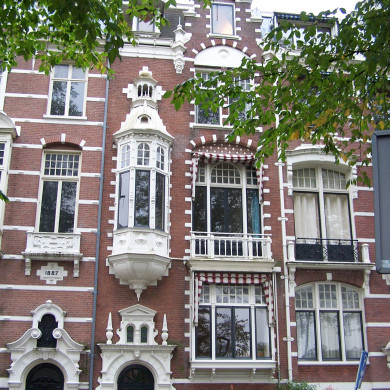 Op een afgeschuinde rechthoekige plattegrond in grauw/rood bakstenen kruisverband opgetrokken woonhuis, onder een flauw hellende geknikte kap, met aan de (gepleisterde) achterzijde een smalle uitbouw van het trappenhuis. Het drie traveeën tellende a-symmetrisch ingedeelde woonhuis telt vier bouwlagen: souterrain, bel-etage en twee verdiepingen. In het brede deel, rechts, zijn de vensters op alle verdiepingen gevat in een band van natuurstenen sierblokken, sluit- en aanzetstenen. Op de begane grond een geprofileerde hardstenen plint. In de linkertravee de ingang. In het brede rechter deel is het venster van het souterrain geplaatst in een dubbele rij sierblokken. De getoogde strek heeft vijf sierblokken. Voor het venster is een decoratief smeedijzeren hekwerk geplaatst. Boven het souterrain loopt een natuurstenen sierband. Op de bel-etage bevindt zich een, op consoles rustende, houten erker met boven het stolpstel een vijftienruits bovenlicht en boven de flankerende ramen zesruits bovenlichten. De lijsten boven en onder zijn voorzien van decoratief snijwerk. De rechthoekige erker draagt het balkon van de derde bouwlaag. Het balkon heeft een eenvoudige balustrade met verticale spijlen tussen de aanzetposten. In het verdiepte kozijn geven openslaande deuren, met vijftienruits bovenlicht, toegang tot dit balkon. De smalle zijramen hebben zesruits bovenlichten. In het timpaan van de korfboog zijn decoratief gemetselde siertegels aangebracht. Onder de topgevel bevinden zich twee vensters met achtruits bovenlichten en stenen onderdorpels. Het timpaan van de segmentboog boven beide vensters is gepleisterd. De in vieren getrapte topgevel met dekplaten heeft bij de aanzet neo- renaissance contreforts en in de top een decoratief smeedijzeren hijsbalk. Het zoldervenster bevindt zich onder een rondboog. Het linker deel heeft een neo-renaissance entree waarbij de gecanneleerde pilasters een rondboog dragen. De geparketteerde deur heeft een waaiervormig bovenlicht. De sluitsteen, in de vorm van een leeuwenkop, draagt een horizontale lijst met daarboven een dubbel rondboogvenster onder een fronton. Deze aedicula wordt geflankeerd door obelisken op vazen en heeft, net als de entree zelf, vleugelstukken. De driezijdige erker rust op een kuip, uitlopend in een console. De cassetten aan de onderzijde hebben diamantkoppen; kozijnhout en lijstwerk zijn decoratief gesneden. De met zink gedekte naaldspits heeft een rondboog lantaarn met uivormige torenhelm. In de spits bevindt zich een kleine dakkapel onder een eigen, ingesnoerde, naaldspits. Ook de dakkapel heeft een ingesnoerde, sterk overkragende, naaldspits. De achtergevel heeft op de bel-etage een veranda onder een flauw hellend lessenaardak met gesneden lijst op decoratief bewerkte houten staanders.