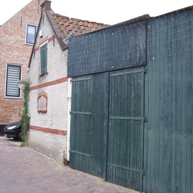 De stal is ingekort; daarop wijzen afgehakte muurgedeelten rechts en links aan de achtergevel. De huidige achtergevel van de stal is onderaan voorzien van (binnen)pleisterwerk, daarboven beschoten (moderne wijziging). De rechtergevel van de stal is voorzien van een venster, een raam met ijzeren roedenverdeling, een dubbele opgeklampte staldeur, een raam met ijzeren roeden en opnieuw een dubbele staldeur. Een hooiluik op het dakschild.