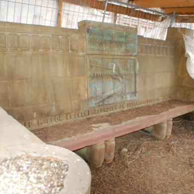 Voor de westvleugel gelegen GEDENKTEKEN uit 1938, in de vorm van een ZITBANK, vervaardigd naar een ontwerp van Brouwer's Aardewerkfabriek te Leiderdorp en opgetrokken in een sobere expressieve stijl die invloeden vertoont van de Art Déco. Aangeduid onder nummer 5 op bijbehorende kaart. De herinneringsbank was een cadeau van de Edese burgerij aan de directie van de Enka ter gelegenheid van het vijfentwintigjarig jubileum van de productie van kunstvezel in Nederland. In juni 1913 werd in Arnhem de eerste in Nederland gemaakte kunstzijde verkocht. Dat gedenkwaardig moment was in 1938 vijfentwintig jaar oud.
