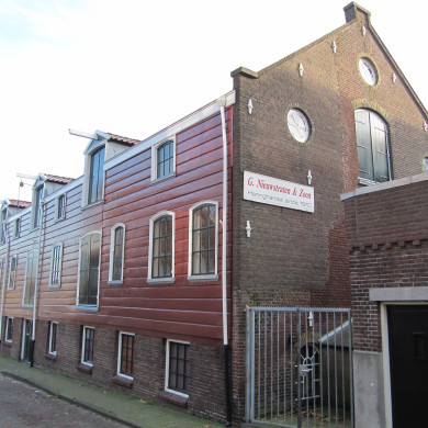 Op een langgerekt perceel aan de Maasstraat, rond 1880 in een utilitaire stijl gebouwd houten HARINGPAKHUIS met kuiperij, zolder en open plaats. Het pand is in 1884 gekocht door Johannes Hoogerwerf Leendertszn, koopman en reder te Vlaardingen. Tussen 1909 en 1916 is het pand in bezit geweest van de maatschappij 'Onderling Grondbezit' te Vlaardingen. Omstreeks 1916 werd, naar aanleiding van een rooilijnwijziging, de houten onderbouw van het pakhuis vervangen door een iets teruggerooide bakstenen onderbouw.
