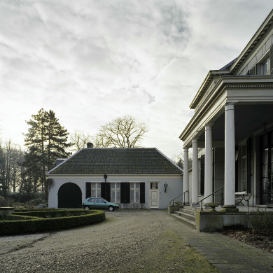 Voor(oprit-)gevel: centraal drie achtruits Empire-vensters met links een dubbele halfronde poortdeur en rechts de rechte entreedeur naar de woning. Linker- en rechterzijgevel: een enkel zesruits Empire-venster.