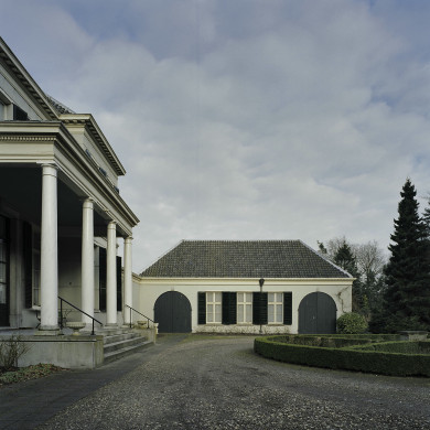 Bakstenen witgepleisterd gebouw op rechthoekige grondslag van een enkele bouwlaag onder met grijze pannen gedekt dubbel schilddak. Het noordelijke bijgebouw werd in verband met de oorspronkelijke functie twee maal zo breed opgetrokken als het zuidelijke bijgebouw. De gevels worden afgesloten door een kroonlijst waarin goot. Het bijgebouw is in de bouwcampagne van het huis samen met het zuidelijke bijgebouw in 1790 opgetrokken. Oorspronkelijk bevatte het bijgebouw het koetshuis en de paardenstal. In 1898 diende het bijgebouw tevens als woning van de jager. In de jaren '80 van de 20ste eeuw is het bijgebouw gerestaureerd en dient onder meer als woning van de tuinbaas.
