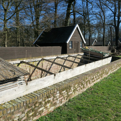 SCHUUR en KOUDE BAK, XIX; in de moestuin. Bakstenen schuur op rechthoekige plattegrond onder zadeldak met rode pannen; topgevels met vlechtingen en hooiluik, waarboven vlieggaten voor duiven. Bakstenen kweekbak met rollaag; zijkanten iets oplopend.