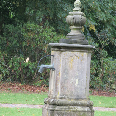 ad a.: midden voor het koetshuis: zandstenen pomp, XVIII; in de vorm van een korte kruispijler; op rijke geprofileerde plint; bekroning met ronde zandstenen urn met deksel met vlam