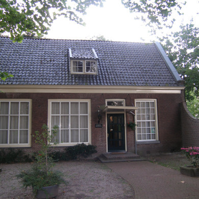 De rechter zijgevel grenst direct aan de straat en wordt gekenmerkt door een afgetopt zadeldak met vlechtingen evenwijdig aan de schuine dakschilden. Begane gronds komt, in het midden geplaatst gevat tussen dorpel met rollaag een driestrooks venster voor onder strekse boog. Ter weerszijden bevindt zich een 2x3-ruits raam op rollaag dorpel. De geveltop is met drie stolpramen ingevuld. Koetshuis en tuinmuur dateren uit de 18de eeuw.