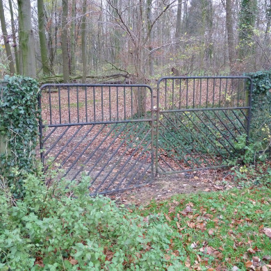 De twee natuurstenen hekpijlers zijn in wezen hergebruikte zuilschachten, iets minder dan manshoog. Het ijzeren hekwerk is geen vijftig jaar oud.