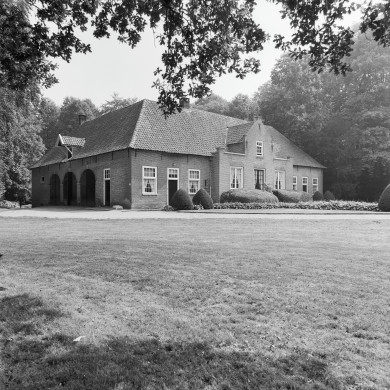 Bouwhuis, XIXa; bakstenen gebouw van één bouwlaag onder schilddak op L-vormige plattegrond. Symmetrische voorgevel (westzijde) van negen traveeën met uitspringende middenpartij met smallere puntgevel van later datum (3 traveeën); meerruitsvensters; noordgevel met drie ronde koetsdeuren waarboven sluitstenen met de data 1850, 1937 en 1816; zuidgevel met één koetsdeur; aan achterzijde aanbouw van later datum; dak met grijze pannen en drie schoorstenen, géén goten.