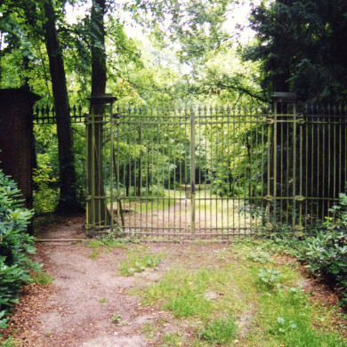2. hek in tuinmuur, aangebouwd aan de westvleugel van het huis, XXb: bakstenen kruispijlers met zandstenen dekplaten waarop zandstenen ronde dekselvazen; ijzeren hekvleugels met spijlen naar het midden oplopend.