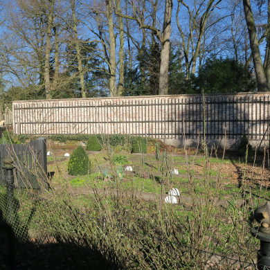 Muren en schuttingen, bestaande uit: a.: moestuinmuur, XIX: gepleisterde baksteen met rollaag; lattenhekken voor leifruit; houten schuttingen, XIX, ook met latwerk voor fruit. b.: muur aansluitend aan de westvleugel (waarin hek genoemd onder 4), XXb: baksteen met ezelsrug. c.: muur aansluitend aan de oostvleugel van het huis, XXb: kort stuk muur met haakse hoek, baksteen met platte rollaag; in de muur een rond deurtje, waarbij de rollaag halfrond meeloopt met de ronding van de deur.