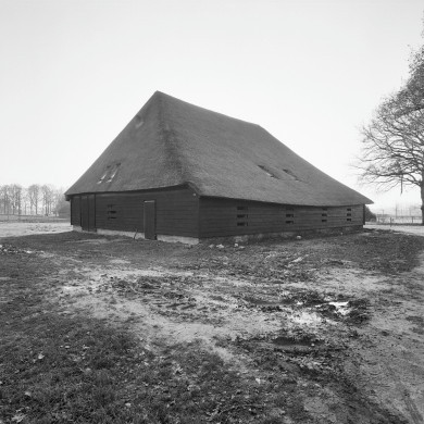 Driebeukige Vlaamse schuur met gepotdekselde wanden en laag aanzettend rieten schilddak. De buitenwanden zijn bij de restauratie opnieuw opgebouwd op een originele fundering, waarbij de in de 20ste eeuw versteende gedeelten gehandhaafd bleven achter de beklamping van nieuwe gepotdekselde en geteerde delen. Inwendig het oorspronkelijke gebint met vijf eenzijdig overstekende ankerbalkgebinten met schoren en verbindingsbalken. Hierop rusten driehoekspanten met gordingen die de nog deels oorspronkelijke sporen dragen.