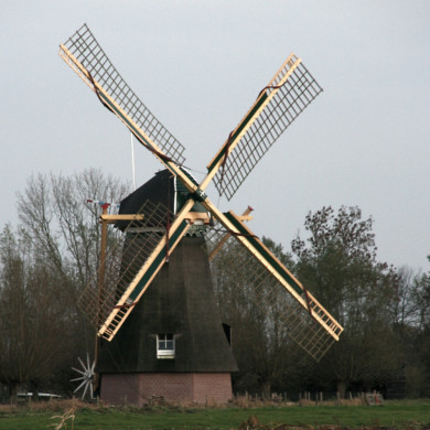 In de zuidgevel smal venster met natuurstenen tweelichtskozijn.