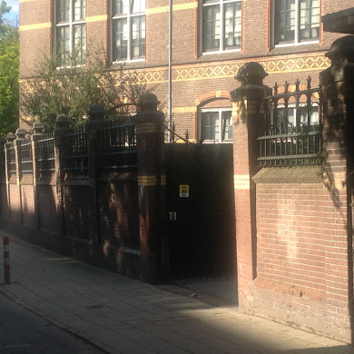 Aan de Roelof Hartstraat wordt het voorterrein van het schoolgebouw afgesloten door een perceelsscheiding met sierlijk smeedijzeren hek.